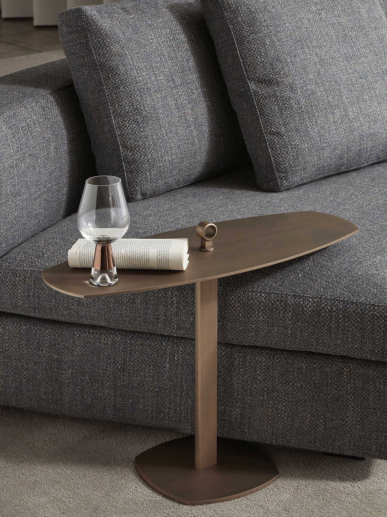 Leaf is an elliptical design server made of metal, designed to be placed next to the sofa so that you always have the items you need most at hand. Its elliptical shape fits well into the seat cushion of the sofa, providing a convenient holder for storing small items such as remote controls, glasses, smartphones or other accessories.